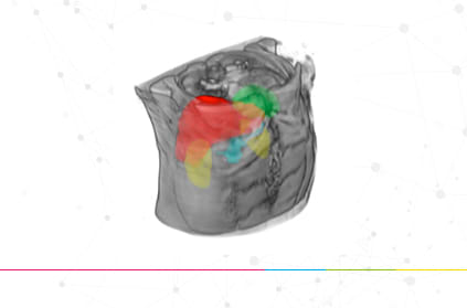 An MRI scan highlighting different organs (Red = liver; yellow = kidneys; blue = pancreas; green = spleen), to enable identification of Type 2 Diabetes complications. (Image based on unpublished UK BioBank data, Wilman et al. Perspectum Diagnostics)